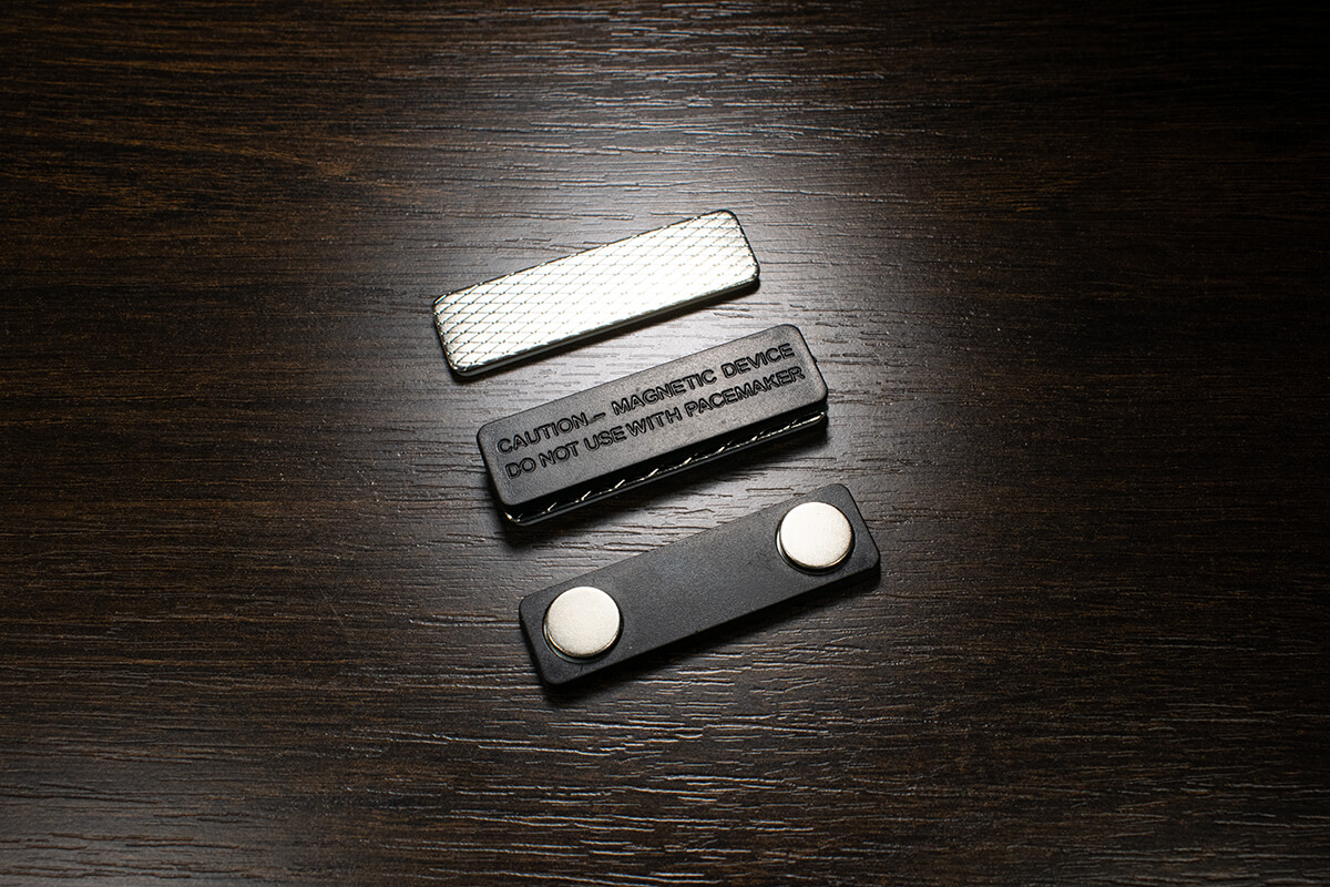 В бейджах на магните применяют пару магнитных клипс, их крепят одна к другой через любой материал, нет необходимости прокалывать одежду. Метод крепления на булавке предусматривает прокол ткани.